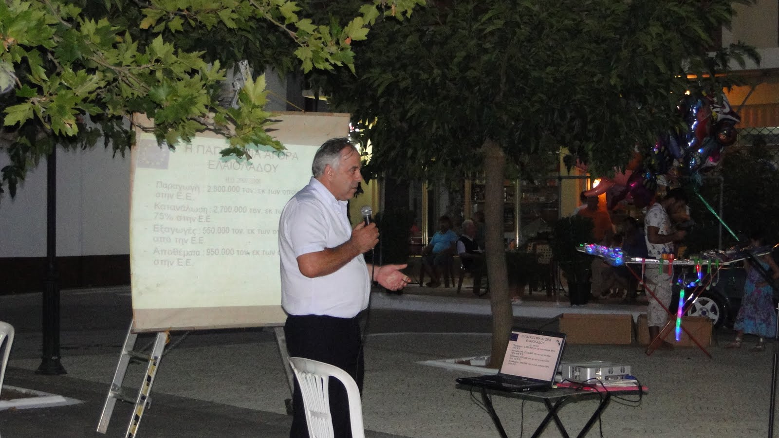 Προσκεκλημένος στην γιορτή ήταν ο γεωπόνος κος Αντ. Παρασκευόπουλος ο οποίος έκανε μια πολύ ενδιαφέρουσα παρουσίαση για το ελαιόλαδο τα προβλήματα και τις προοπτικές του. Παρούσα στην εκδήλωση ήταν και η κα Αντωνία Μπούζα, πρόεδρος της ΝΕΤΠ (Νομαρχιακής Επιτροπή Τουριστικής Προβολής).